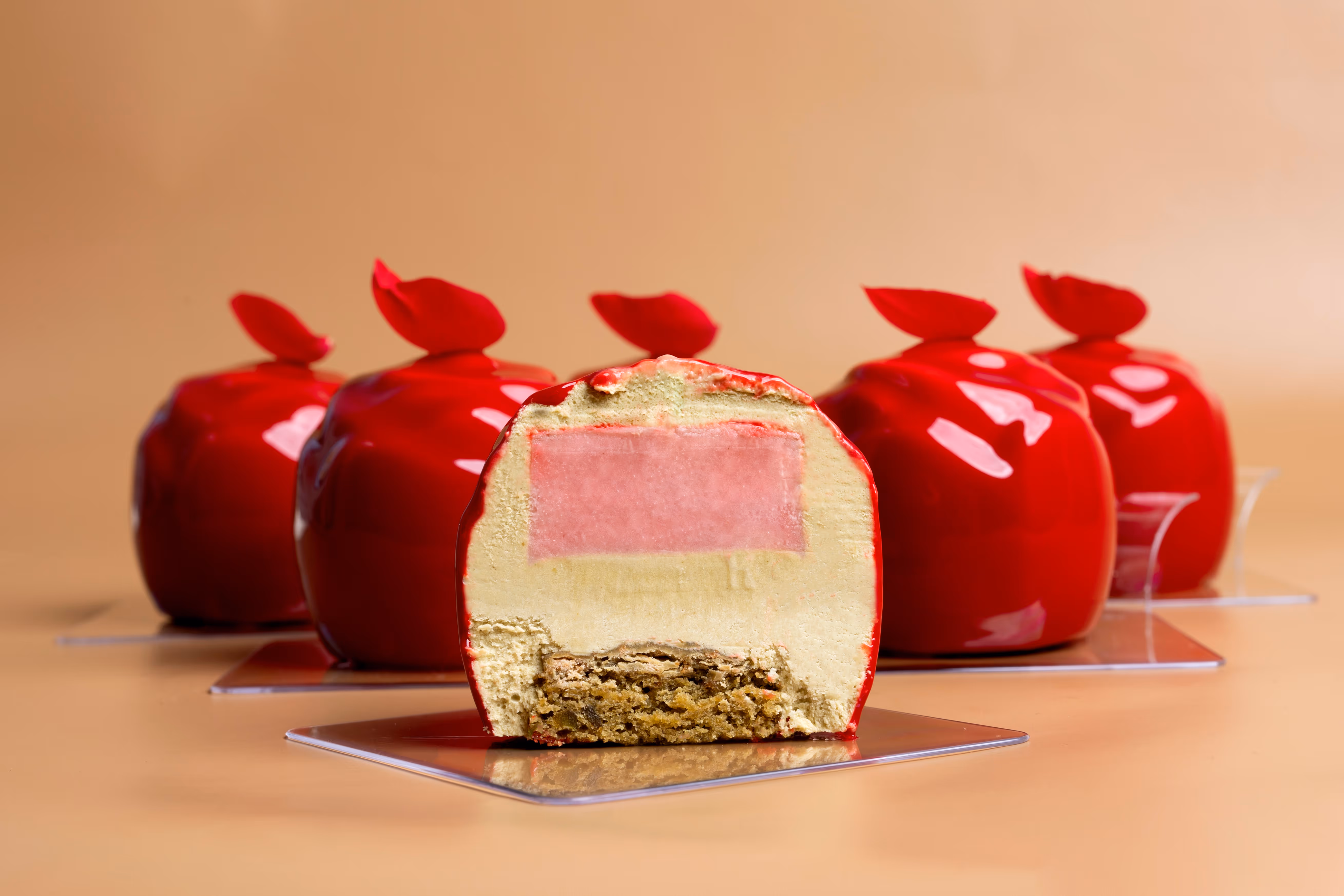 Mus biała czekolada z pistacją/ cremeux malina-róża/ financier pistacjowy/ polewa świecąca